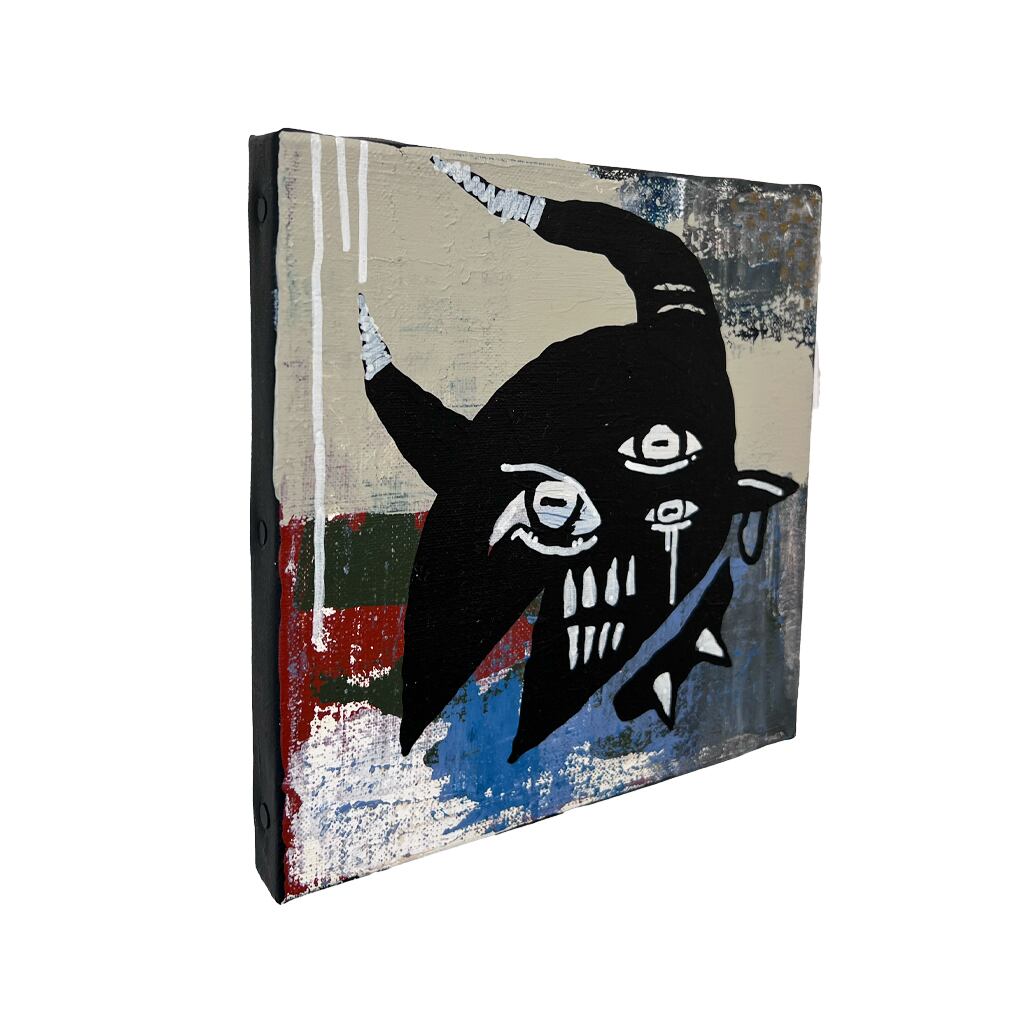 制作 : 2025 サイズ:w.180mm x h.180mm(厚さ18mm) ベース : 麻キャンバス貼り木製フレーム 画材:アクリル絵の具、墨汁、マーカー、えんぴつ ※カラーは実物と差異がある場合がございます。予めご了承ください。
