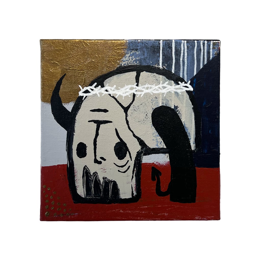 制作 : 2025 サイズ:w.180mm x h.180mm(厚さ18mm) ベース : 麻キャンバス貼り木製フレーム 画材:アクリル絵の具、墨汁、マーカー、えんぴつ ※カラーは実物と差異がある場合がございます。予めご了承ください。