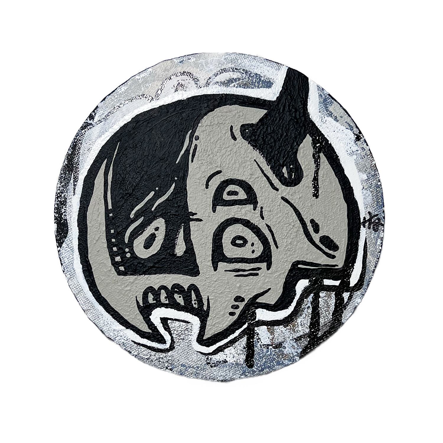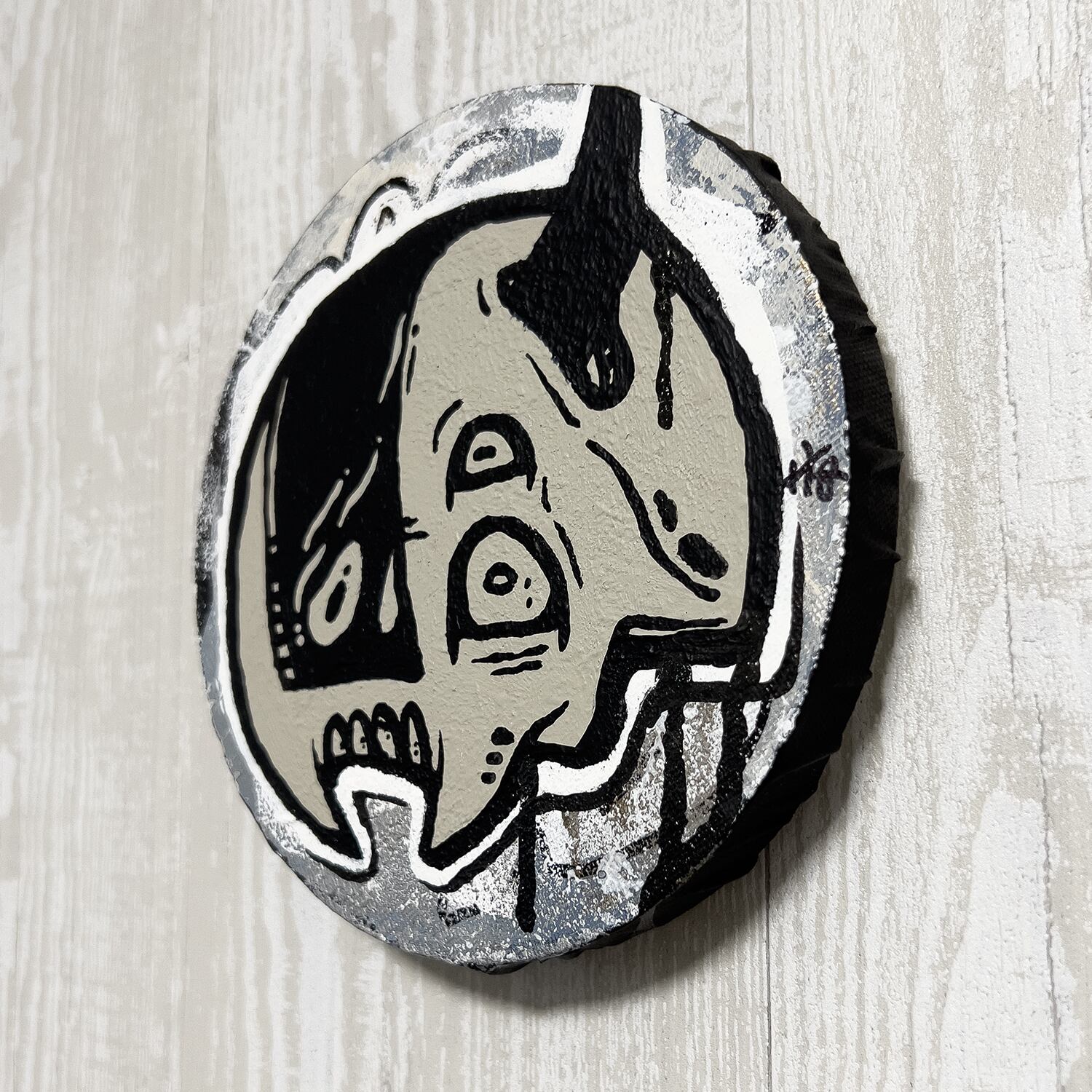 異形の骸骨を被った黒塗りの骸骨、2重の骸骨がモチーフとなっているアートシリーズ「DARKMIND」の円形キャンバスです。